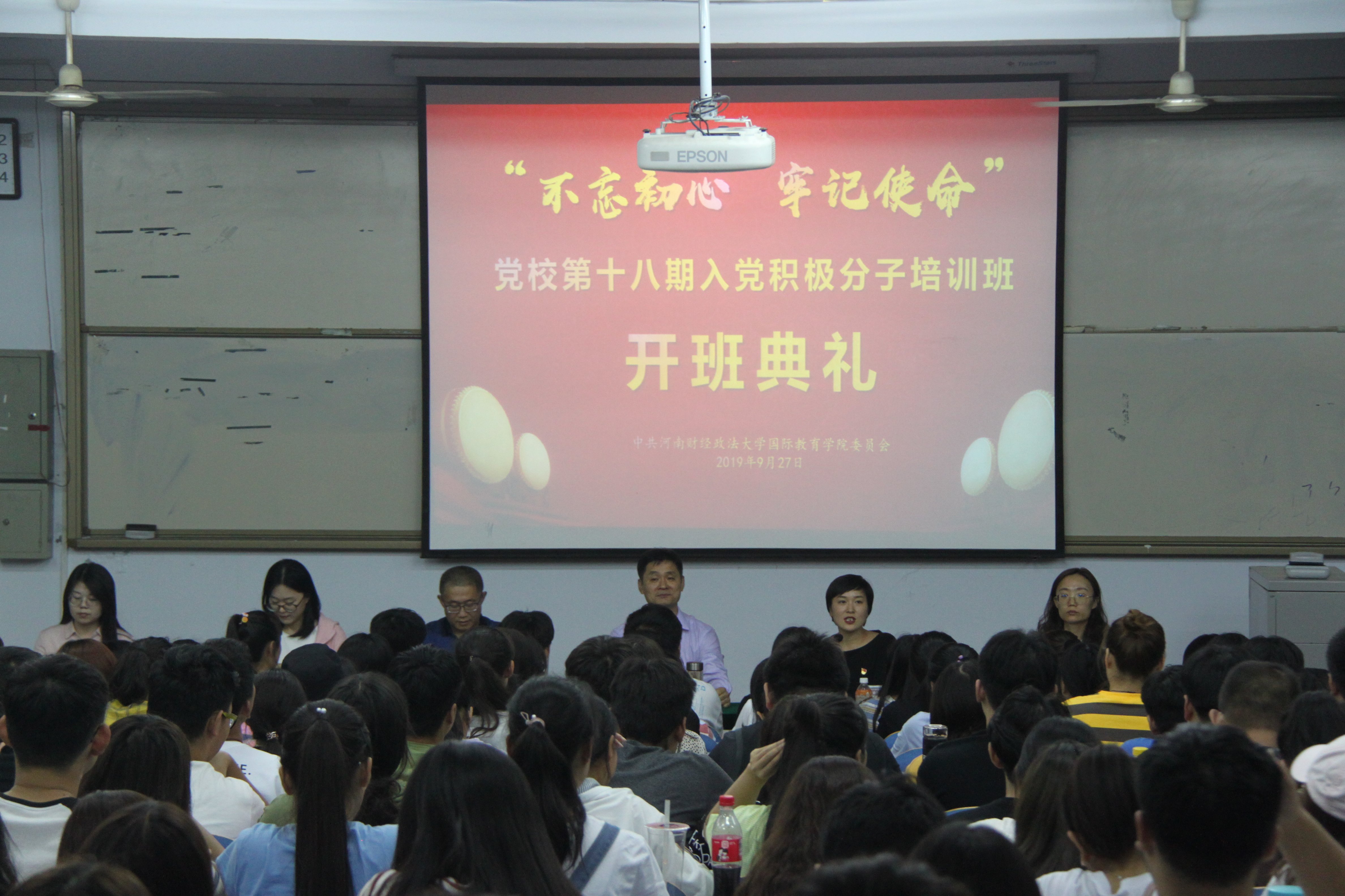 2019年9月27日晚18:30,谈球吧在文北校区二东一教室举行党校第十八期入党积极分子培训班开班典礼。公司党委副书记姜保忠、熊辉,员工党支部书记、委员,第十八期入党积极分子培训班学员及大一新生代表出席了本次典礼。典礼由院团委书记、第一员工党支部书记张晓静主持。