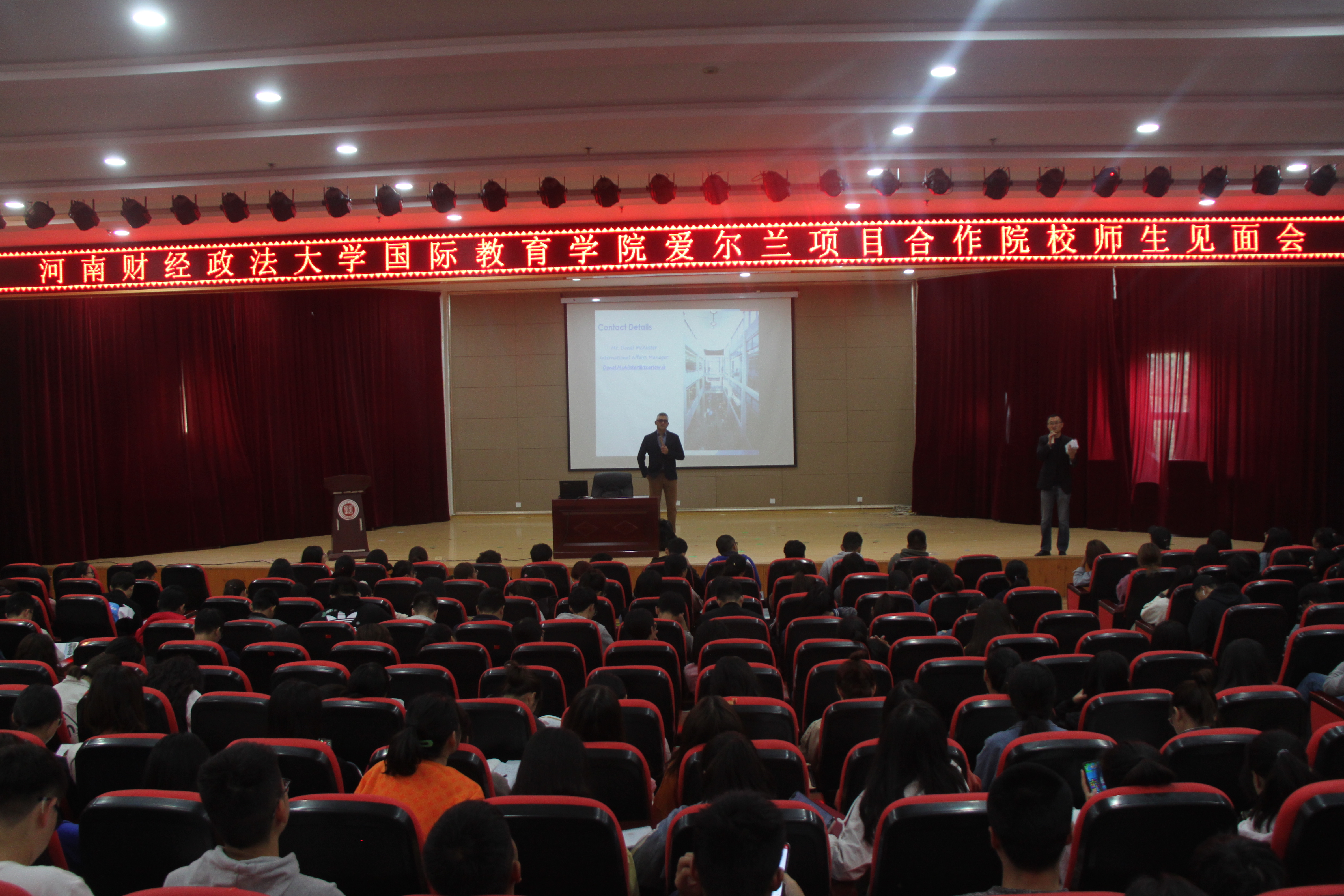 2019年10月30日,公司于4号楼报告厅举办爱尔兰合作办学项目师生见面会。爱尔兰卡罗理工学院国际项目办公室主任Donal McAlister出席本次会议,爱尔兰卡罗理工学院中国办公室主任宿峥主持此次大会,2019级全体员工参加。